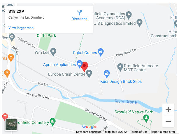 We are on the right handside of the road as you come down Callywhite Lane from the mini roundabout at Dronfield bottom. We are a large building (Apollo Appliances) just after the William Lee foundry. For full details click the link below which will direct you to Google maps.